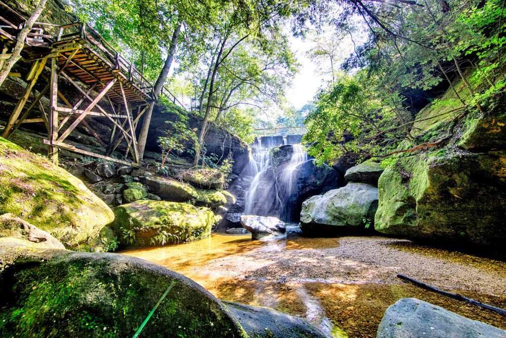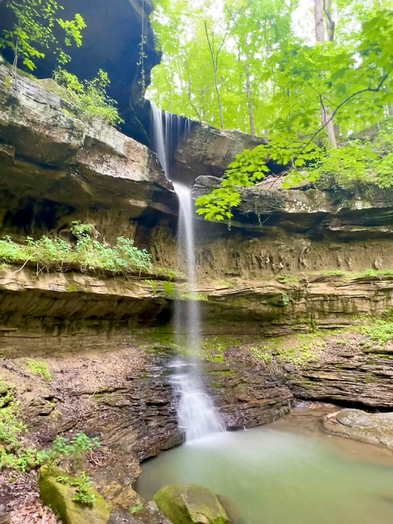 Dismals Branch Creek plunges 15 feet over beefy boulders to form Rainbow Falls—the centerpiece that greets visitors at the entrance to Dismals Canyon.